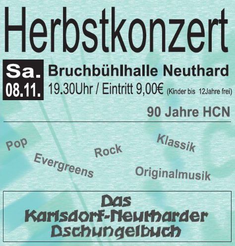 Beim traditionellen Herbstkonzert in der Bruchbühlhalle am Samstag, 8. November 2025 um 19.30 Uhr erwartet die Zuhörerschaft im ersten Teil eine bunte Mischung aus konzertanten, klassischen und modernen Stücken, gespielt von unserem 1. Orchester und dem Seniorenorchester sowie unserer Jugend-Spielgruppe. Im zweiten Teil spielt unser Projektorchester, bei dem wir einige ehemalige und neu eingestiegene Spieler*innen integrieren durften. Zusammen mit Gesangssolist*innen und Tanzformationen wird das eigens geschriebene Musical „Das Karlsdorf-Neutharder Dschungelbuch“ uraufgeführt, welches auch das 50-jährige Fusionsjubiläum der Gemeinde ehrt.